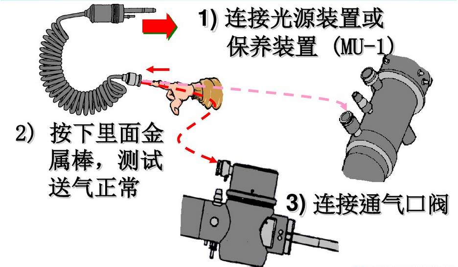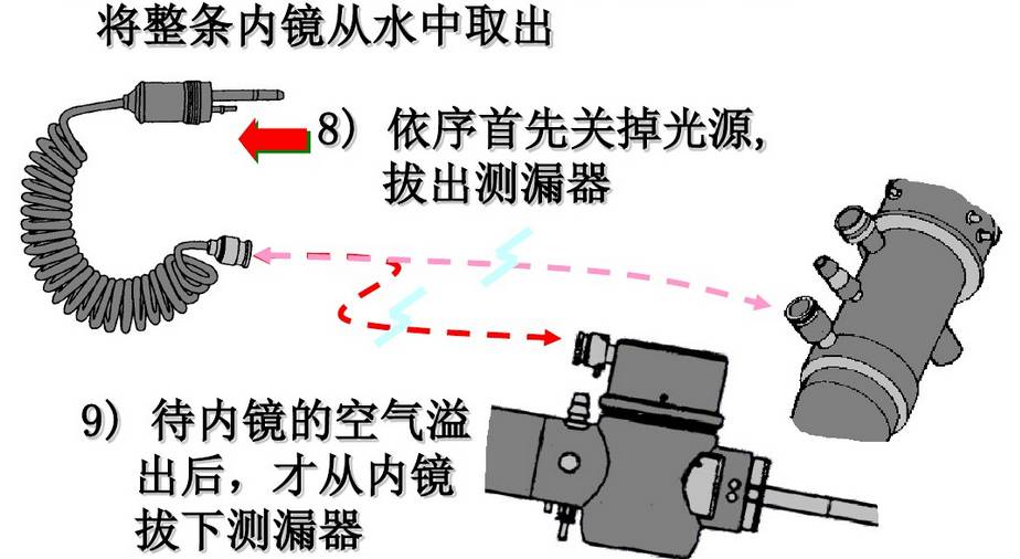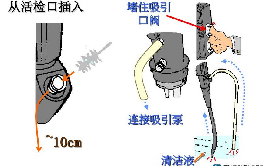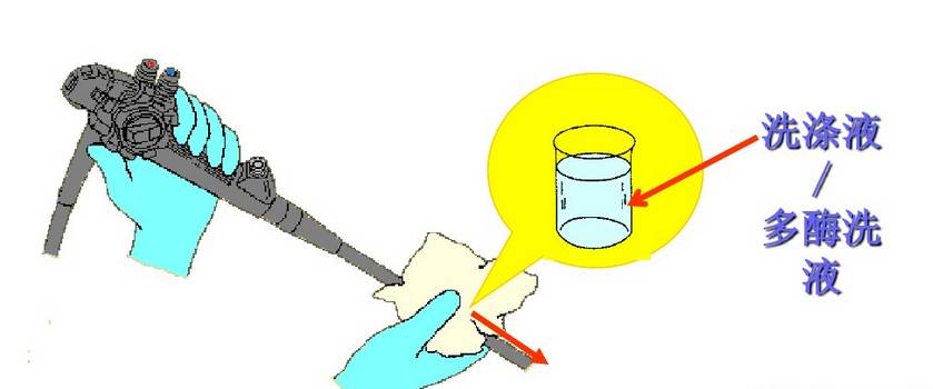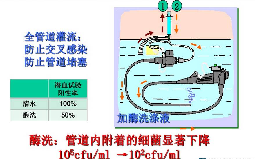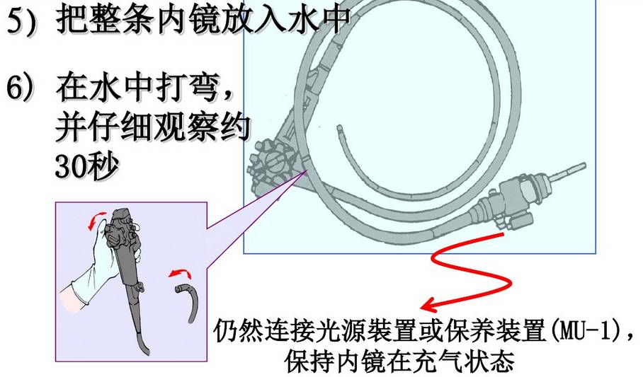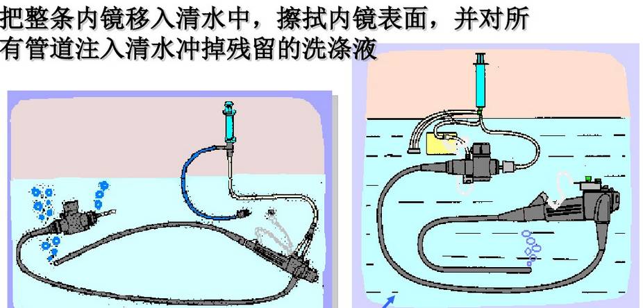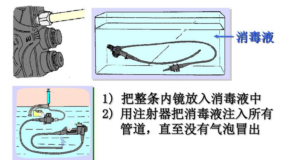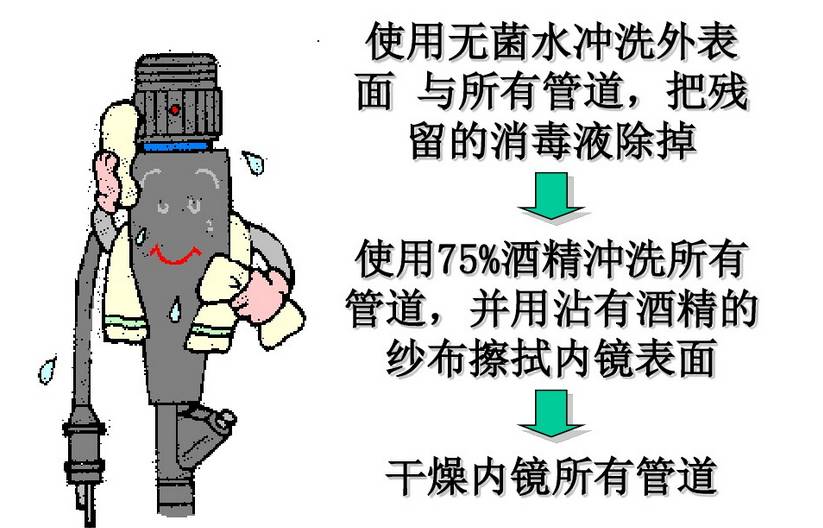 内镜清洗消毒流程 内镜的手工清洗消毒: 《一》:床侧清洗 所需器具: 清洁的绒布 、 清洁的海绵 、50ml注射器 、 水水 1.擦拭插入部 将清洁的无绒布或海绵浸入水中,擦拭内镜的整个插入部,从操作的保护套向先端部擦拭 警告 如果每次患者手术后没有进行立即清洗使用过的内镜和附件,残留的组织碎屑就会干燥并凝固,从而难以清楚,而且还会降低清洗、小豆、灭菌功效。所以每次术后必须立刻进行内镜和附件的床侧清洗。 2、用水冲洗钳子管道 2.1松开锁定环,从内镜取下灌流插头,将其放入盛有洗涤液的容器内。 2.2将一个50ml的注射器安装到灌流插头口处,并注入50ml的水,重复三次。 2.3将一个50ml的注射器安装到灌流插头口处,槟注入50ml空气,冲刷钳子管道 3、从光源取下内镜 警告 如注意导光束接头处温度极高,小心烫伤 4、取下导光束和导光束适配器 《二》:内镜侧漏 所需器具: 侧漏器(手压泵) 操作过程: 水 警告 1、将侧漏器的接头帽(ETO帽)接到内镜的通气接头时,确定其彻底干燥 2、浸泡时请勿安装/取下侧漏器,在水中安装或取下侧漏器会使水进入内镜,从而造成内镜的损坏 3.侧漏的过程中,弯曲部的表皮会膨胀,由于内部气压增大导致,属于正常情况 《三》:手工清洗 所需器具: 管道开口清洗刷 、 吸引接头清洗刷 、一次性单头清洗刷 、 盆、清洁的无绒布、50ml注射器、水、洗涤液 3.1.清洗表面 3.2刷洗管道 3.3用洗涤液冲洗钳子管道 3.4去除管道的洗涤液 3.5 用干燥的无绒布干燥外表 警告 1、小心操作插入部,持握太紧或者弯度过度可能会拉伸软性部和弯曲部的表皮,导致严重的损坏 2、在清理管道内部和内镜的钳子管道口,刷洗不充分会带来感染机会 3.管道清洗刷为一次性耗材,反复使用会导致刷头弯曲,从而导致使用过程脱落 《四》:手动消毒 所需器具: 盆、清洁的无绒布、清洁50ml注射器、无菌50ml注射器水、消毒液 4.1将内镜浸泡在消毒液中 4.2从消毒液中取出内镜,并用50ml无菌注射器的空气冲洗钳子管道 《五》:消毒后冲洗内镜 所需器具: 无菌棉签、无菌无绒布、无菌大盆、75%的乙醇、无菌50ml注射器、冲洗用水 《六》:内镜与附件的灭菌 6.1灭菌前均应彻底干燥内镜与附件 6.2适于压力蒸汽灭菌的內镜或者內镜部件应当采用压力蒸汽灭菌,注意按內镜说明书要求选择温度和时间 6.3环氧乙烷灭菌方法适于各种內镜及附件的灭菌 6.4低温过氧化氢等离子灭菌方法处理效率较快,与大部分器械兼容,如果不兼容器械会发生外观的变化和退色 6.5不能采用压力蒸汽灭菌的內镜及附件且没有低温灭菌设备,可以使用2%碱性戊二醛浸泡10h以上灭菌,消毒液进行消毒、灭菌时,有轴节的器械应当充分打开轴节,带管腔的器械腔内应充分注入消毒液 6.6导光束等线圈类的接头部不可水洗,可用蘸清水软布擦拭清洁。 6.7进行气体灭菌前,务必将ETO帽安装到内镜的通气接头上。 |